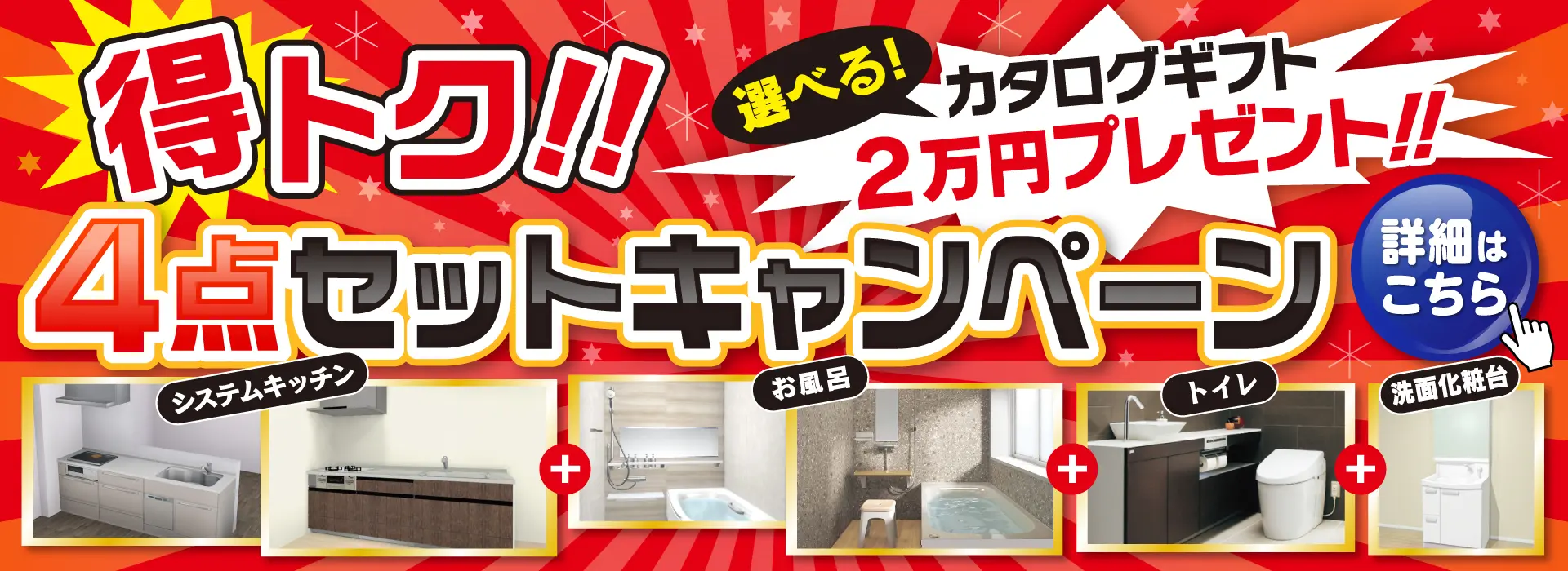 チラシリニューアルしました!お得な4点セットキャンペーンも始まりましたので、お得なこの機会をお見逃しなく!先ずはトップページのバナーをクリック♪ キッチンリフォーム/お風呂リフォーム/トイレリフォーム/洗面化粧台リフォーム/給湯器交換/屋根・外壁リフォーム/住宅省エネ2024キャンペーン/子育てエコホーム支援事業/先進的窓リノベ2024事業