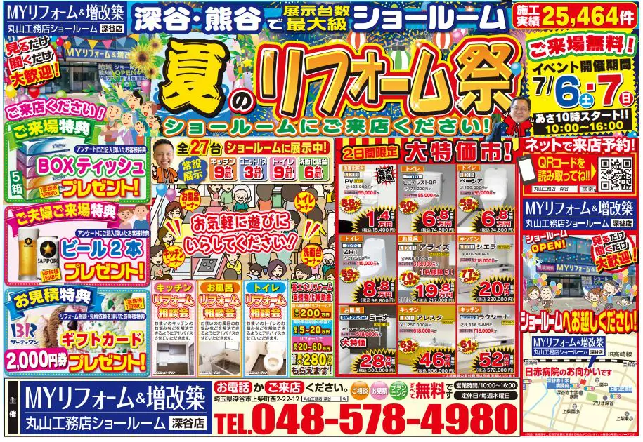 2024年9月7(土)・8(日)は深谷ショールームへ!台風やゲリラ豪雨への備えは万全ですか?お得な二日間に是非ご来場&ご相談ください♪ いつもありがとうございます。埼玉県秩父/深谷地域のリフォーム・増改築・リノベーションは丸山工務店へお任せください!