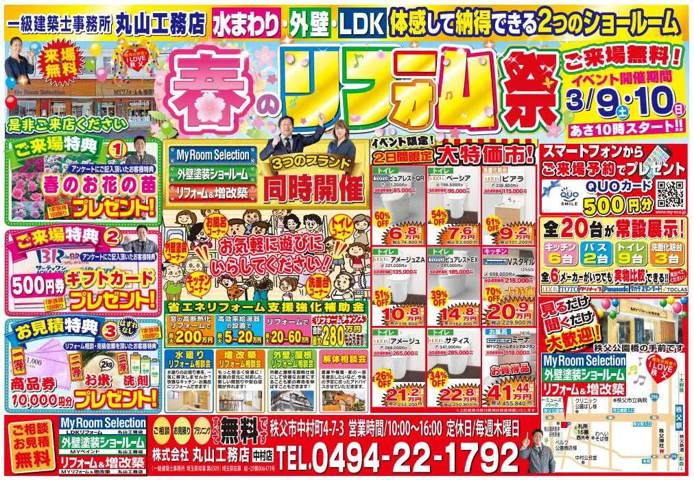 【秩父・深谷ショールーム】3/18~4/30の期間中に、ホームページから来店予約でQUOカード1000円分プレゼント!いつもの2倍で超お得♪ ご予約は「来店予約フォーム」からお願いします。この機会をどうぞお見逃しなく! いつもありがとうございます。埼玉県秩父市・深谷市のリフォーム・増改築・リノベーションは丸山工務店へお任せください!