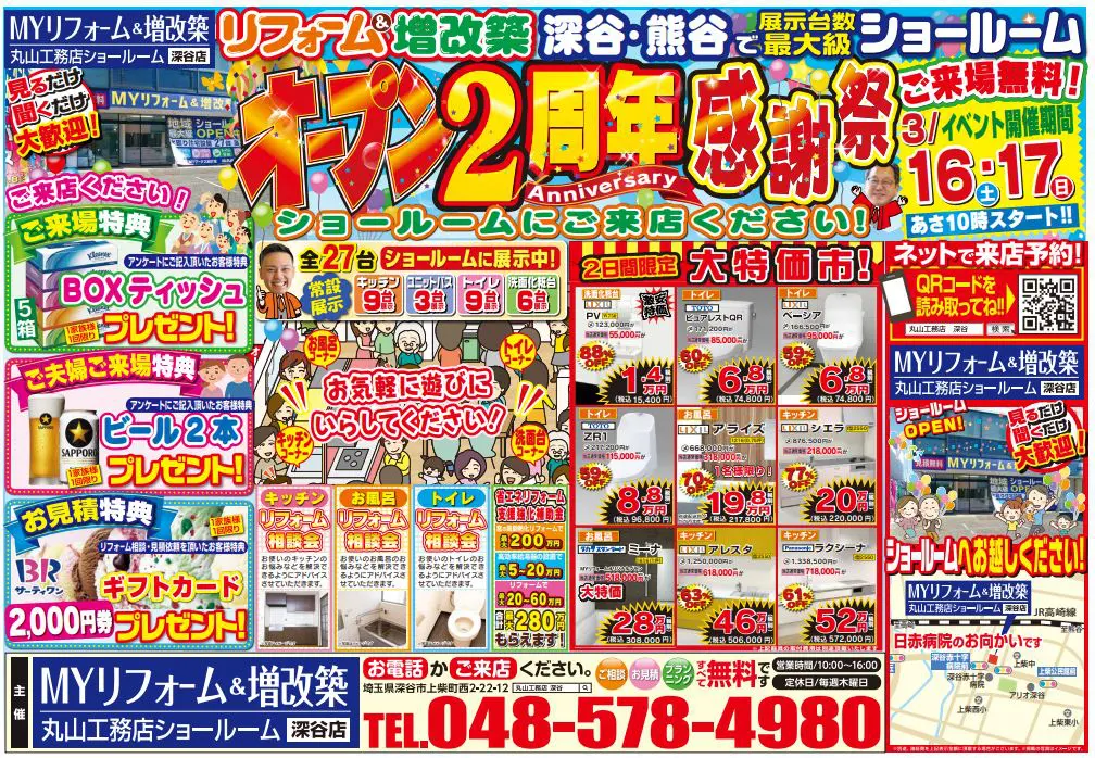 2024年3月16(土)・17(日)は深谷ショールームへ!おかげさまで深谷ショールームはオープン2周年を迎えることができました。日ごろの感謝の気持ちをこめてイベントを開催します!ご家族皆様でのご来場をお待ちしています いつもありがとうございます。埼玉県秩父/深谷地域のリフォーム・増改築・リノベーションは丸山工務店へお任せください!