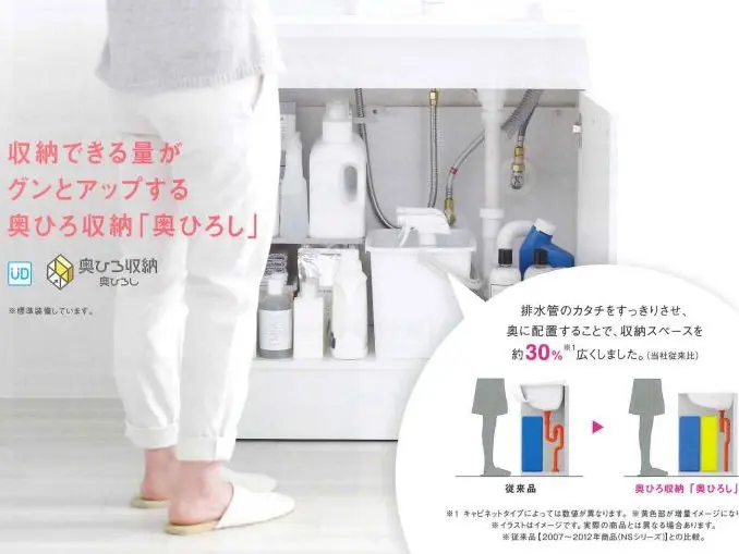 排水管を右奥にレイアウト。収納スペースが広がりバケツやストック品などもしまいやすくなりました。