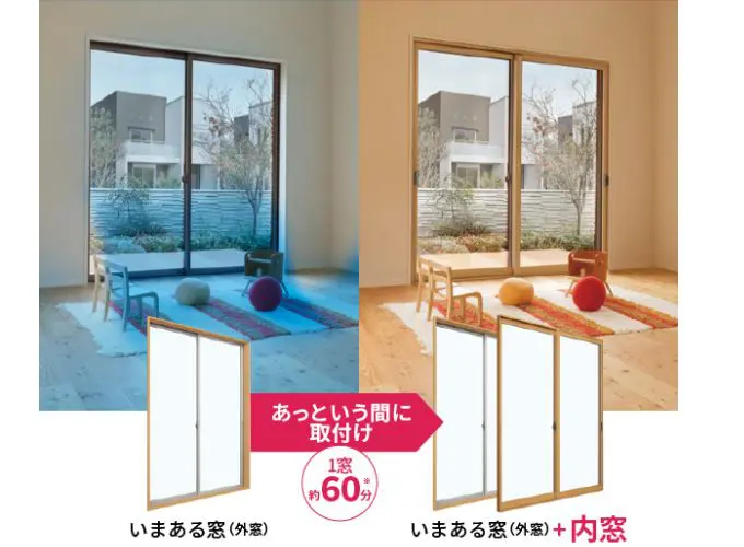 今ある窓の内側に内窓を取付けるだけで、断熱性をアップし、寒さ暑さのお悩みを解消。 ※施工時間は窓サイズや納まりによって異なります。